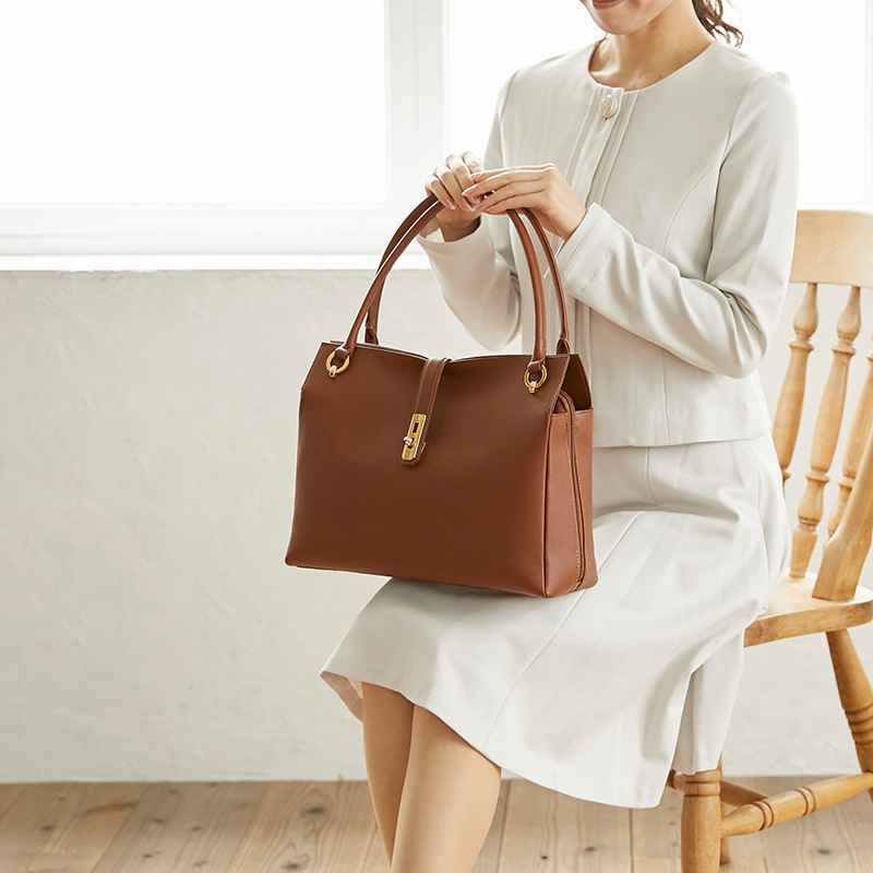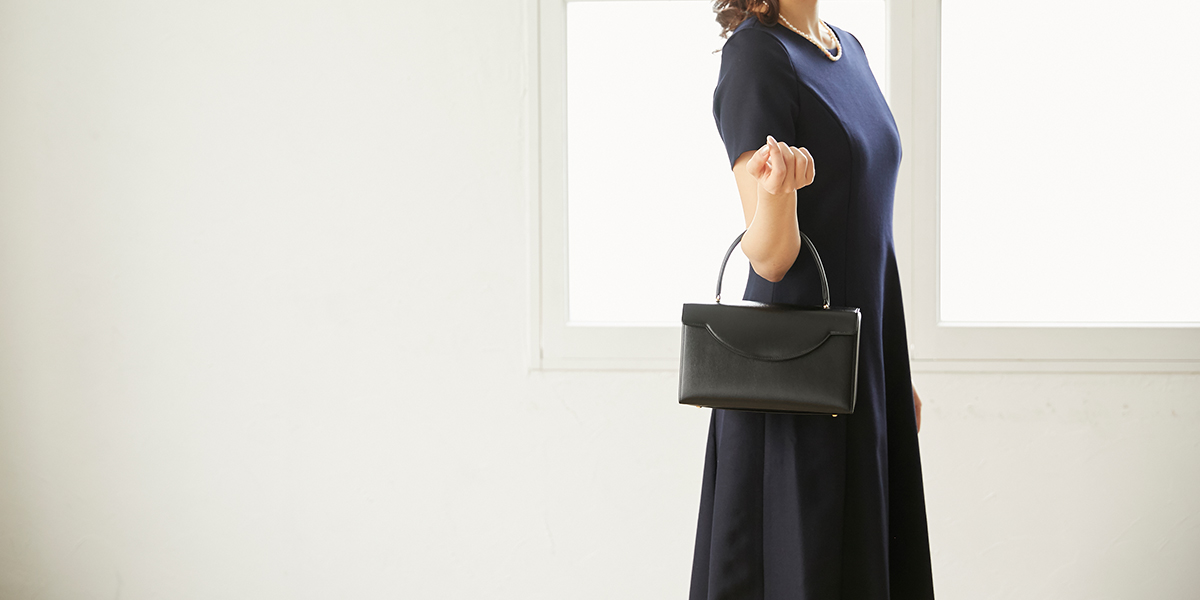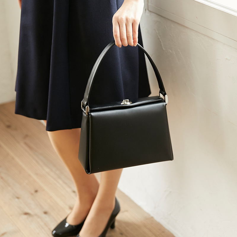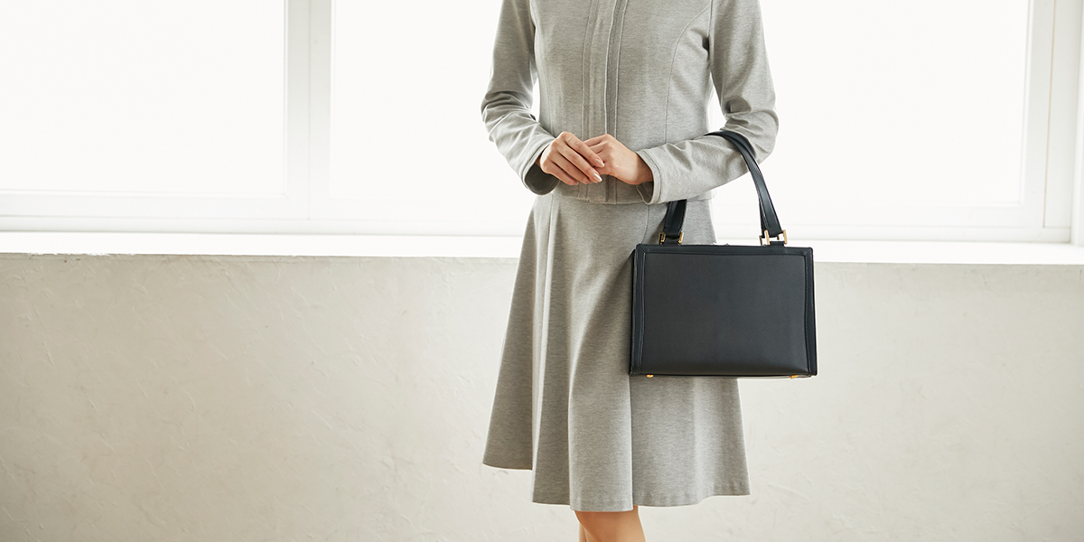 一般的にはブラックかネイビーの革を使用したシンプルかつ素材の良いバッグが好ましいです。革の光沢はおさえ、金具は目立たず控えめなシルバーが好ましいと言われています。 メインのバッグは膝の上に置き、サブバッグは着席時に足もとに置きます。そのためどちらも自立するタイプをお選びいただくのがおすすめです。また、メインバッグの大きさは着席時に膝の上にちょうどおさまる程度のあまり大振りでないサイズが良いでしょう。尚、肩掛けのトートバッグや、ブランドロゴがしっかり入ったようなブランドもののバッグは、カジュアルバッグという位置付けになりますので、このようなシーンには向いていません。