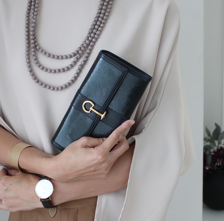 小銭を一目で確認し取り出せる、機能性抜群のコインケースを備えた大人気プリマシリーズのギャルソンウォレットです。表面のエナメル生地にはしわ加工を施すことで、指紋がつきにくく上質なデザインを保ちます。幸運を招くモチーフでもある馬蹄を留め具に採用しており、幸せを受け止め、ためこめるようにという想いを込めております。