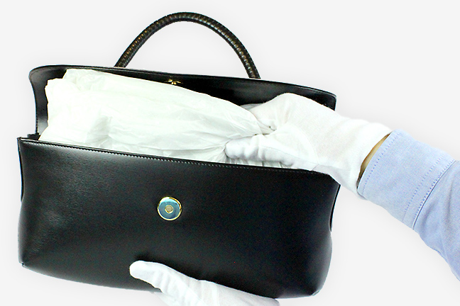 バッグを使用しないときには、中にあんこ(紙をまるめたもの)を入れ、形を整えて保管してください。