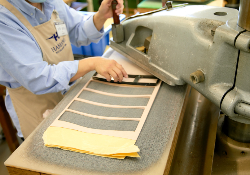 裁断には大きく分けて「手裁ち」と「抜き」の二種類の方法があります。裁断の基本は、型紙を元に「抜き型」と呼ばれる大きな刃を作り切り抜いていく作業ですが、機械では裁断できない繊細な部分などは手裁ちで抜いていきます。