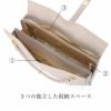 中央のあおり型ポケットで3つに仕切られたデザインで、収納口が大きく開き、出し入れしやすく使いやすさ抜群です。センターポケットは貴重品や大切な書類などたっぷり入る収納力。ファスナーは一番下まで開き、全開時もサイドに三角マチがあるため中身がこぼれる心配もありません。ハリのあるレザーを使用して芯材を最小限に抑えることで、オールレザーにもかかわらず、わずか550gという軽量化を実現しました。