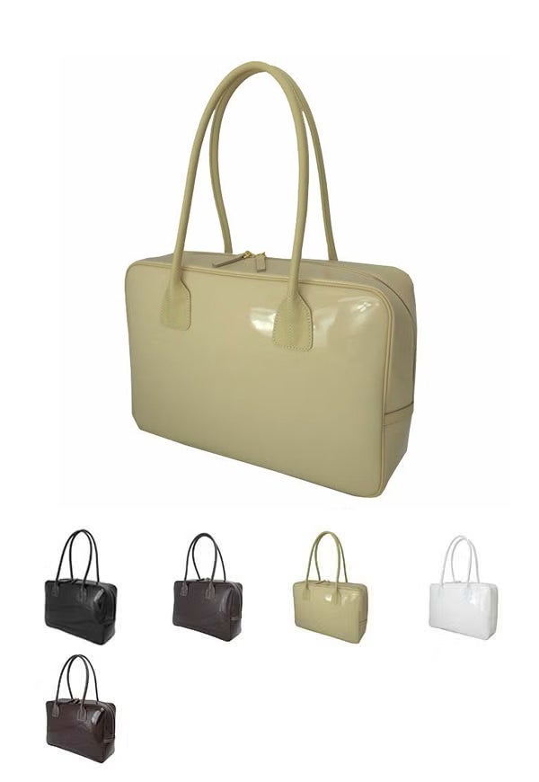A4サイズ収納可能、実用的なエナメルボストンバッグです。シンプルなフォルムにエナメルの艶めき、洗練された大人の女性をより引き立てます。型崩れしにくく、ボストン特有の形状で容量もあり、中は整理整頓しやすい、とっても使いやすいバッグです。雨の日でも気にならず、お手入れもしやすい!エナメルをカジュアルに持ちたいという方にもおすすめのバッグです。