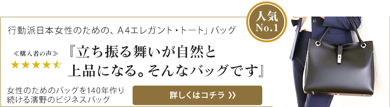 ここからは、創業140年以上の歴史を持つ濱野皮革工藝が、働く女性の通勤シーンを想定してお作りした通勤用バッグをご紹介します。